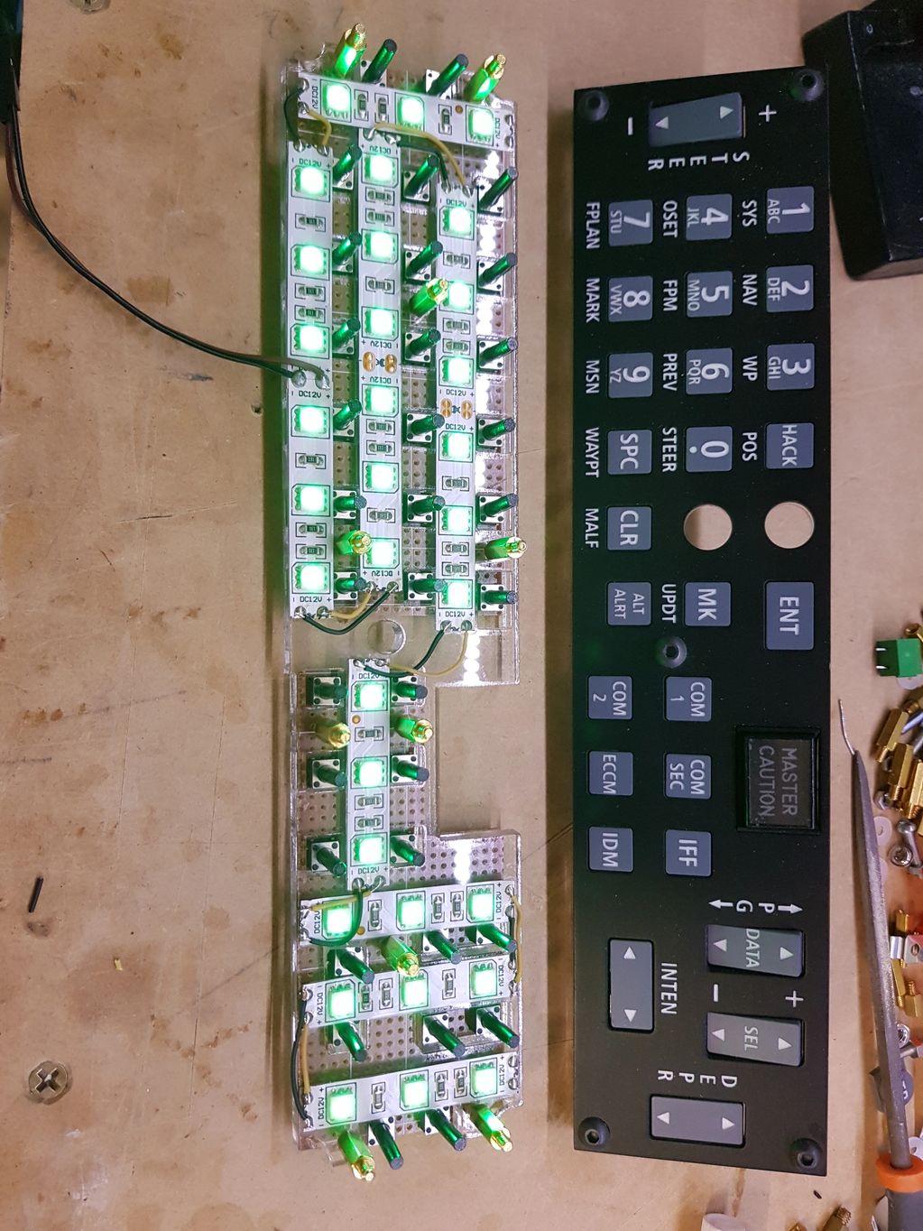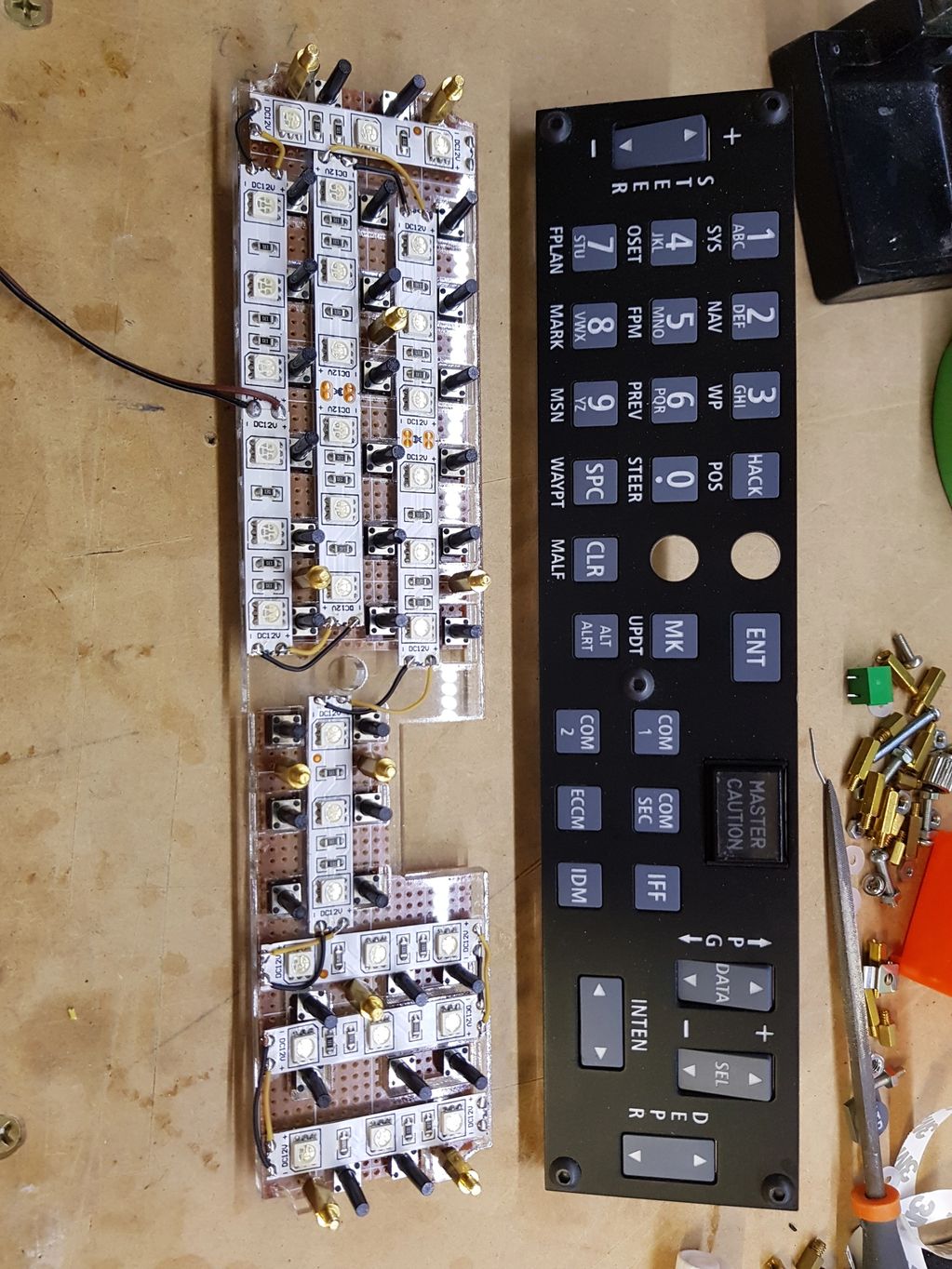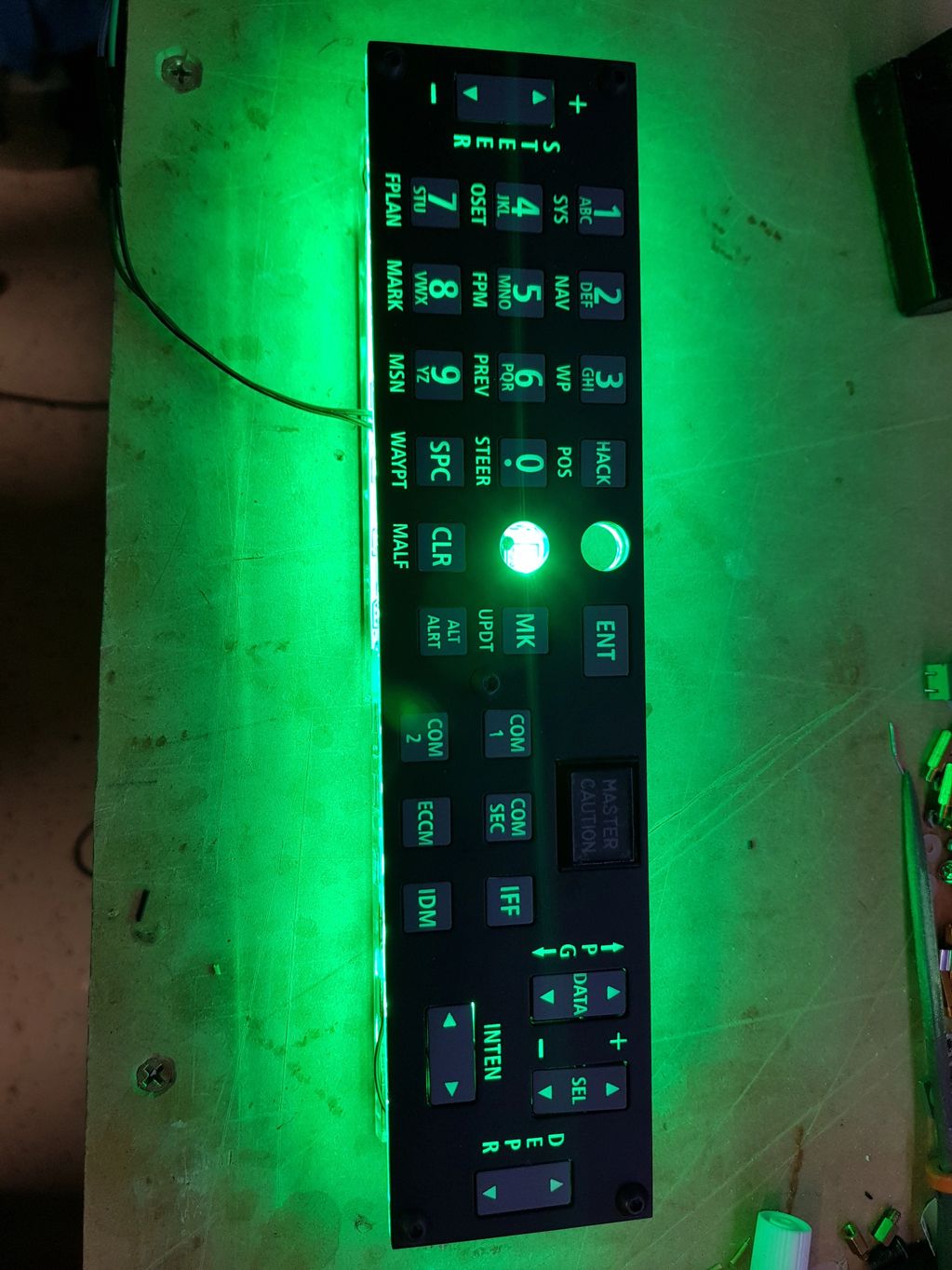 I did try some cheap LED backlit tactile buttons, however found that when illuminated they were far too dim to be effective. Tactile buttons with quality LED's in them are much more expensive that normal tactile push buttons, and for the CDU and UFC I needed 111 buttons (77 in the CDU and 34 in the UFC).