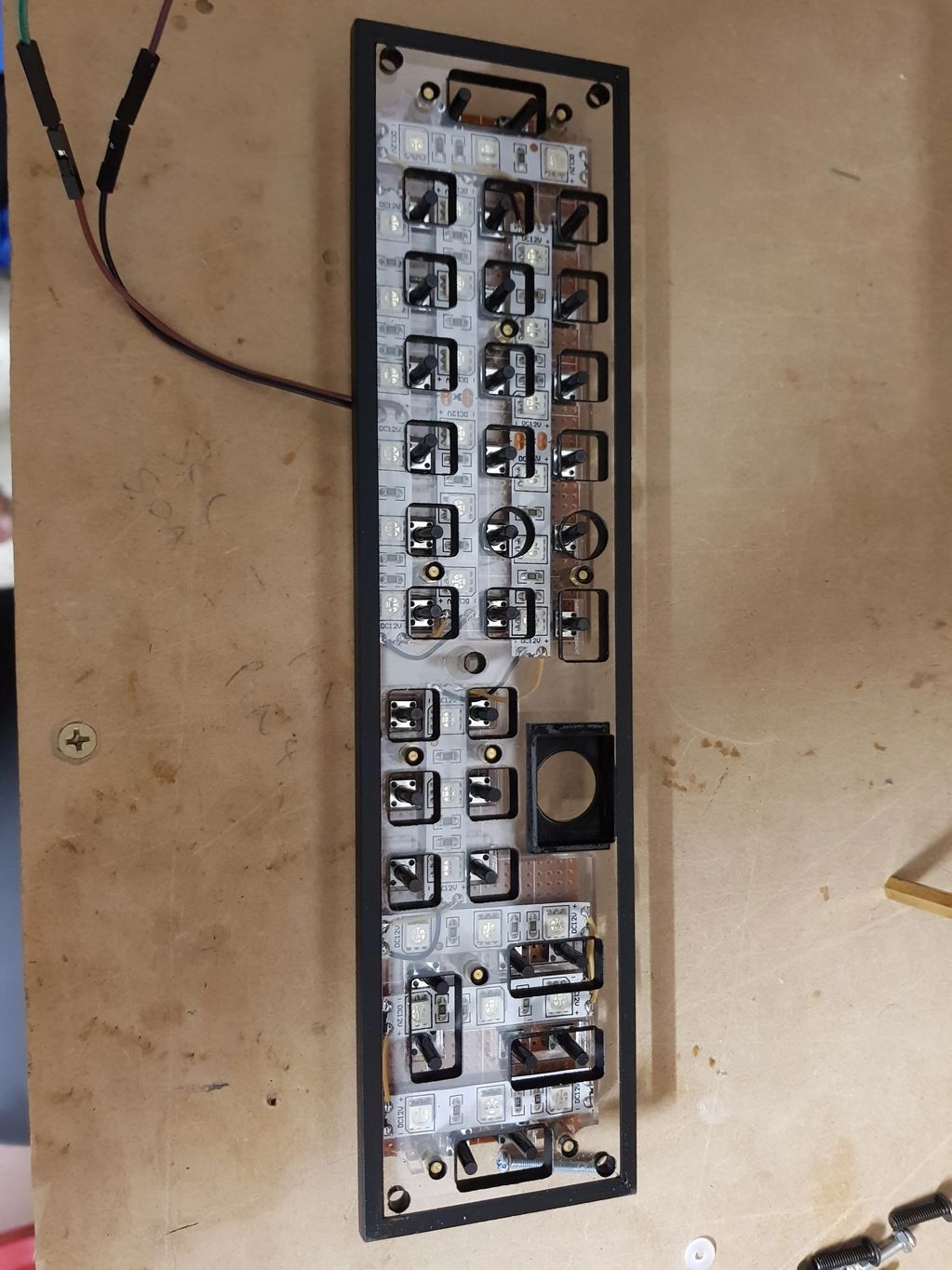 The keypad assembly mounted to the spacer, with the backlight LED strip stuck on and ready for wiring. The cheapest self adhesive LED strip i could find on eBay. You could even use RGB strip if you wanted too.