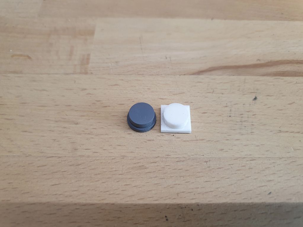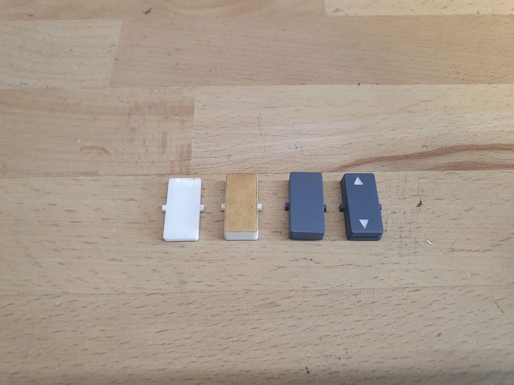 An early error in the design of my round button caps. I later made them again like on the left, with the rear part square. If round, the button will be able to freely rotate in the panel and you will end up with upside down text.