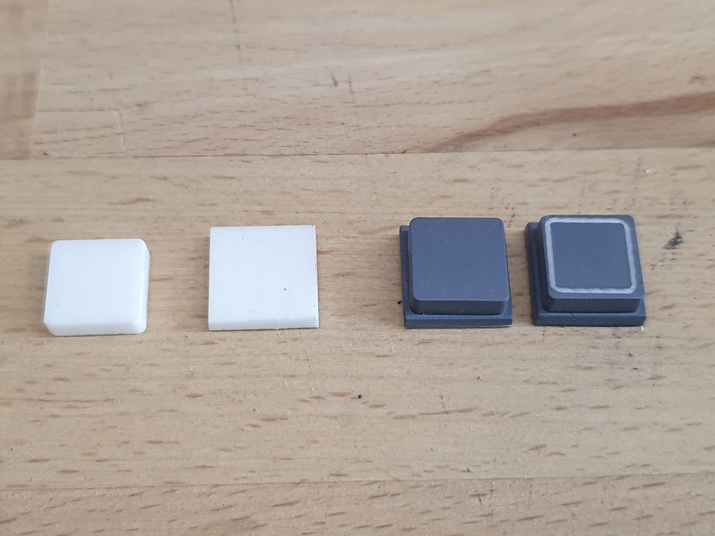 Parts of a buttons layed out. From left to right, the 3mm white top, the 2mm white bottom, glued together and painted, then engraved. Note that this one was a failed button, as the engraved square wasnt centred. I made almost twice the number of buttons i needed, and only the best ones made it into a panel.