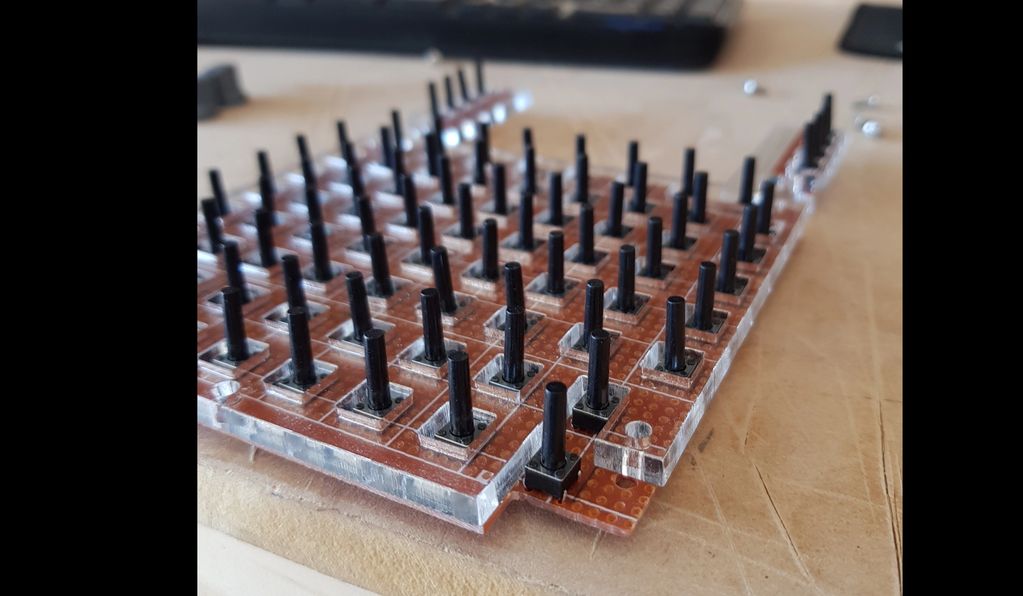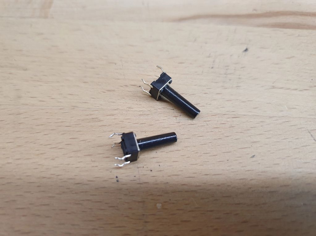 The tactile buttons I use for all keypads. They have a 16mm long shaft, long enough to get through the spacer panels and touch the rear of the buttons. They can be easily trimmed with a sharp knife id they are too long.
