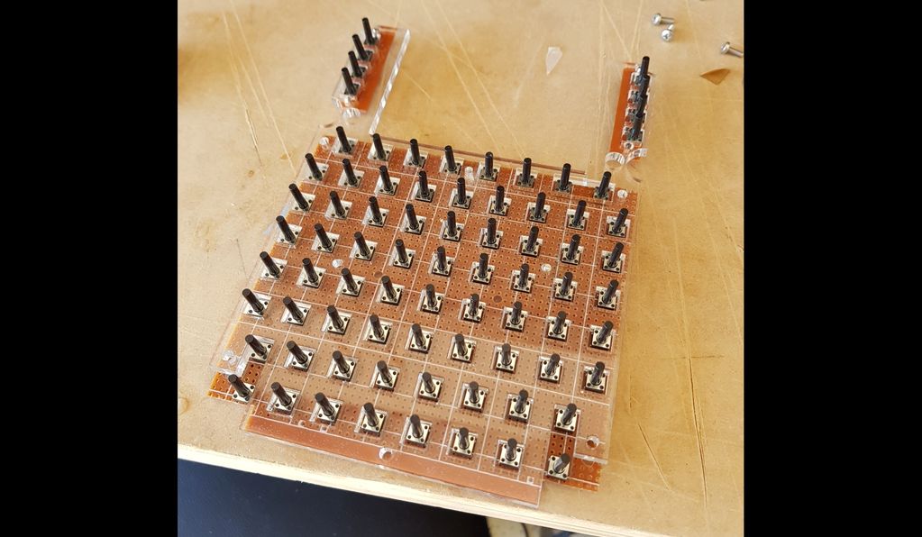 The tactile buttons mounted in prototype PCB. The clear panel is a spacer for the CDU, and the square cutouts in it allow me to make sure the buttons are perfectly positioned before soldering them in place.