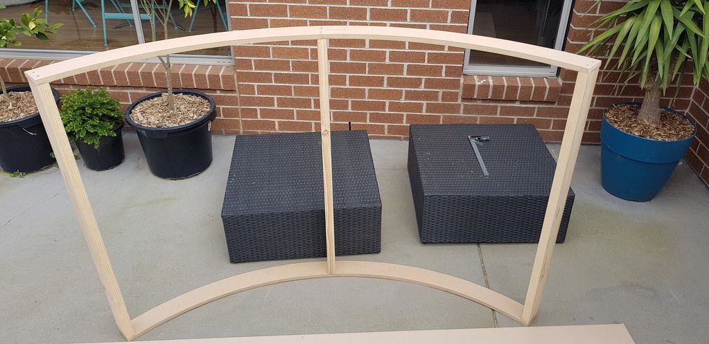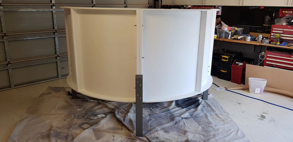 The design is pretty simple, a timber frame made of with a 3mm MDF surface, that is painted and bolted together. The most difficult part was cutting the curved ribs. I did this by hand, out of large sheets of MDF. Nothing fancy here, i marked and measured it by hand, and drew the curve by putting a nail in the center of my arc, then running some string with a pencil out to get a nice, even, curved line that was the inner radius. This was then cut with a jigsaw. All the ribs were then screwed together, then tidied up with a belt sander so all were curved exactly the same. Two curved ribs for each 90 degree section, three beams holding them 1.2 meters apart, then the skin on the curve. I originally had two curves and moved it into the room.