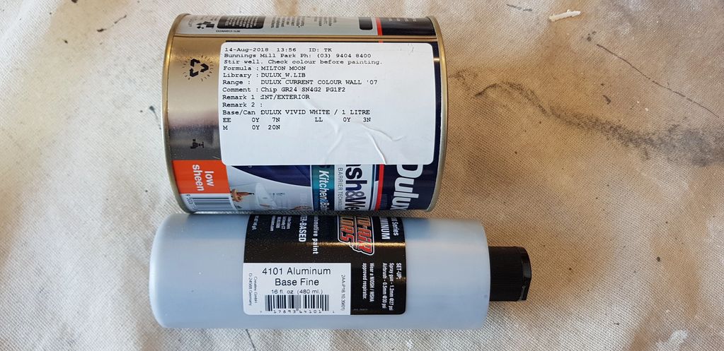 (960ml) of "Dulux Wash&Wear 1L +Plus Kitchen & Bathroom Vivid White Low Sheen Paint” tinted to 'PN2G5 Milton Moon' (this is a Dulux color) from Bunnings.