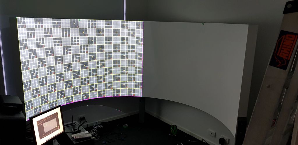 Here is the first time i tried warping the image. One projector is showing a grid, and you can move all the points of the grid points around to match your curve.