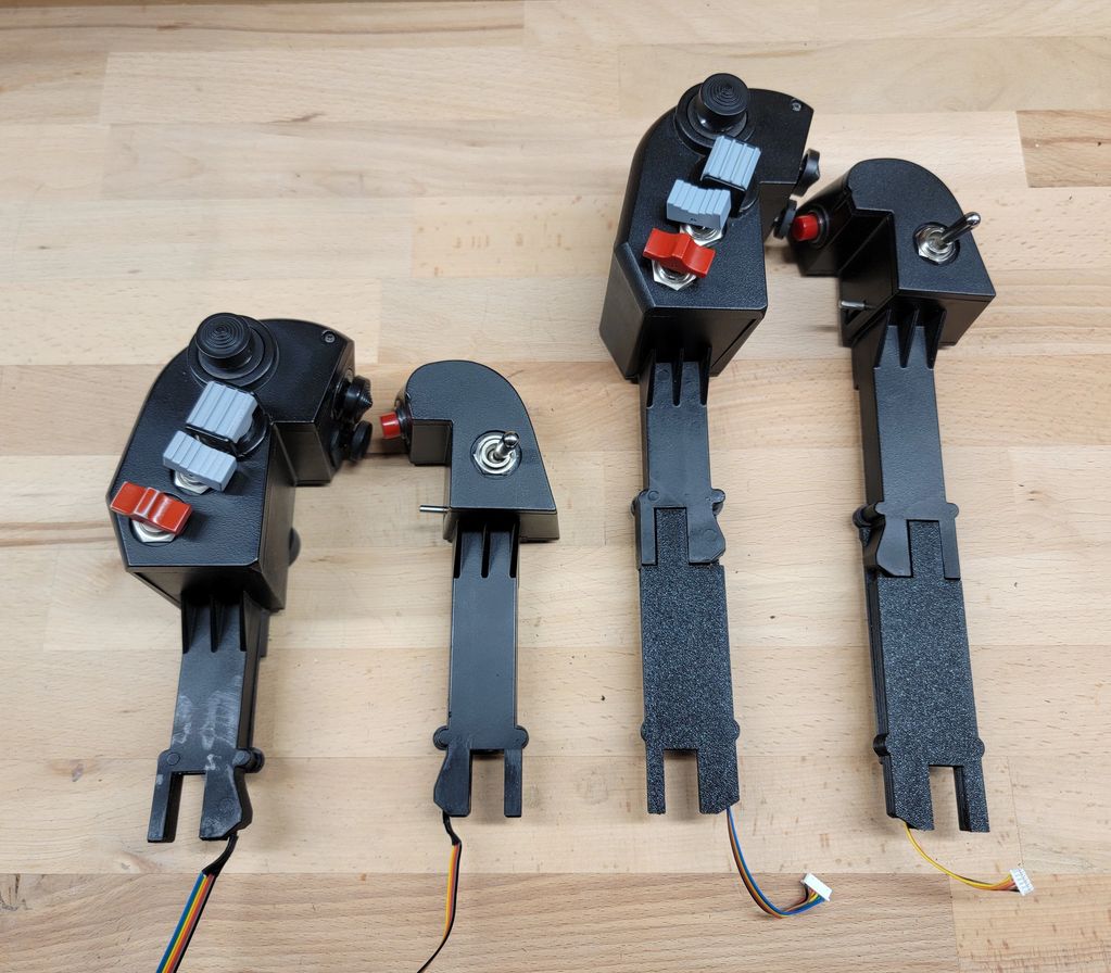 Here is the modified throttle in the foireground, compared to a standard throttle in the background. Painted grey, new faceplates, locking toggles switches and a magnetic EAC switch.